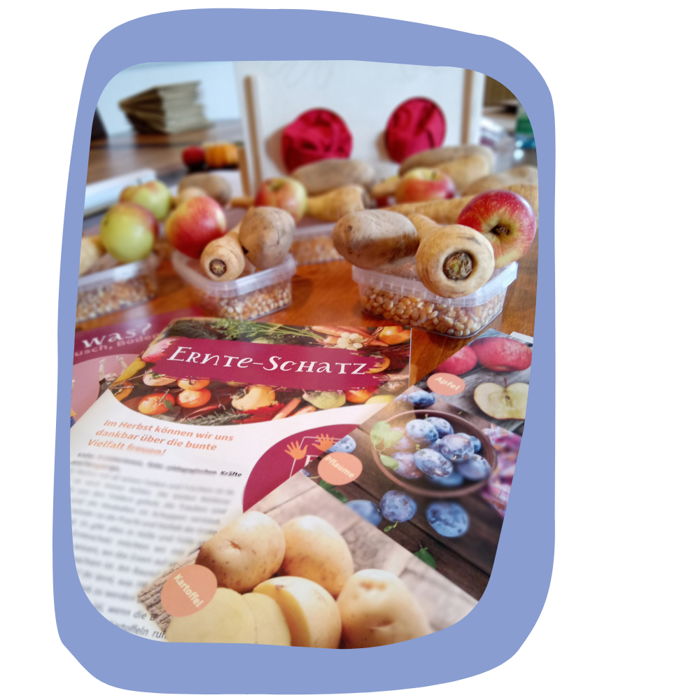Bei unserem Fühlbox-Set „Ernteschatz“ können die Kinder zum Beispiel einen Regenbogen aus Obst und Gemüse legen und lernen viele neue Obst- und Gemüsesorten kennen. Hier haben wir für euch zusätzlich eine kostenlose Ernährungsbildungs-Aktion rund um den Regenbogen auf unserem Teller geschnürt. Schnell und einfach umgesetzt. Probiert es doch einfach mal aus.